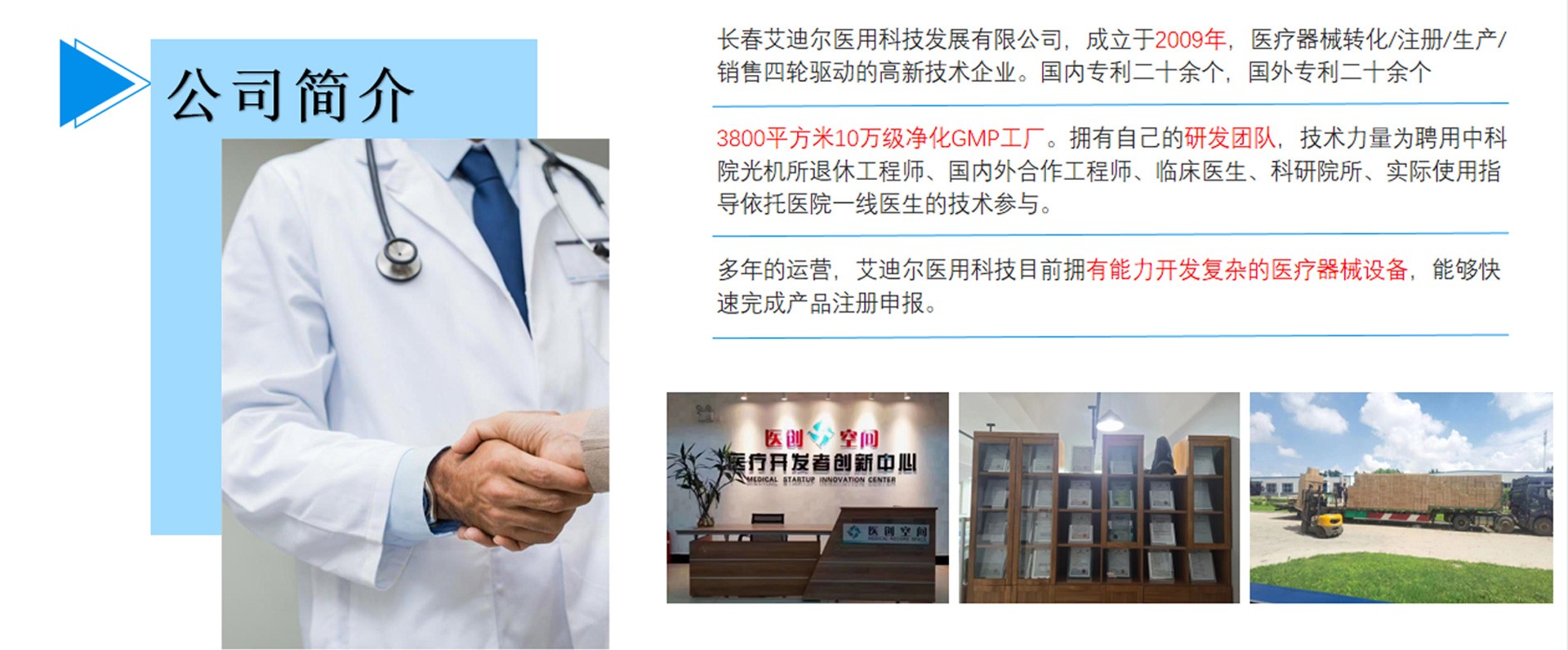 長春艾迪爾醫(yī)用科技發(fā)展有限公司為集產(chǎn)(自有工廠); 學(xué)(多所院校科研課題合作單位);研(研發(fā)成果轉(zhuǎn)化注冊)三位一體的高新技術(shù)企業(yè)。艾迪爾科技主要經(jīng)營范圍為一次性醫(yī)療器械耗材的開發(fā),專注于抗菌肽新材料的開發(fā)和研制,以“IN-58抗菌肽一類新藥及原料藥注冊、激光類治療儀”兩個(gè)核心優(yōu)勢技術(shù)為中心。公司擁有標(biāo)準(zhǔn)GMP車間及健全的質(zhì)量管理體系,擁有多個(gè)已上市和即將上市的產(chǎn)品,包括睡眠、泌尿、口腔、肝膽、消殺、婦科六大系列產(chǎn)品線。公司擁有核心專業(yè)技術(shù)報(bào)批團(tuán)隊(duì),承接國內(nèi)外醫(yī)療器械專項(xiàng)成果轉(zhuǎn)化,具備自主研發(fā)能力及MAH服務(wù)能力。